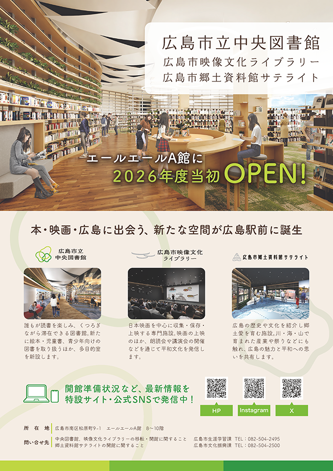 | お問合せ | ・中央図書館、映像文化ライブラリーの移転・開館に関すること 広島市生涯学習課 TEL:082-504-2495 ・郷土資料館サテライトの開館に関すること 広島市文化振興課 TEL:082-504-2500 |